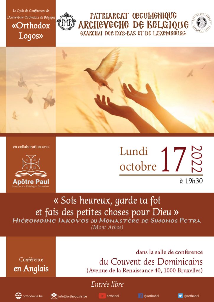 Le Cycle de conférences « Orthodoxos Logos » de l’Archevêché de Belgique, a l’honneur de vous inviter à la Conférence de l’Hiéromoine Iakovos de Simonos Petra (Mont Athos), le lundi 17 octobre 2022 à 19h30, en la salle des Conférences du Couvent des Dominicains de Bruxelles (Avenue Renaissance, 40 – 1000 Bruxelles – Métro Schuman).